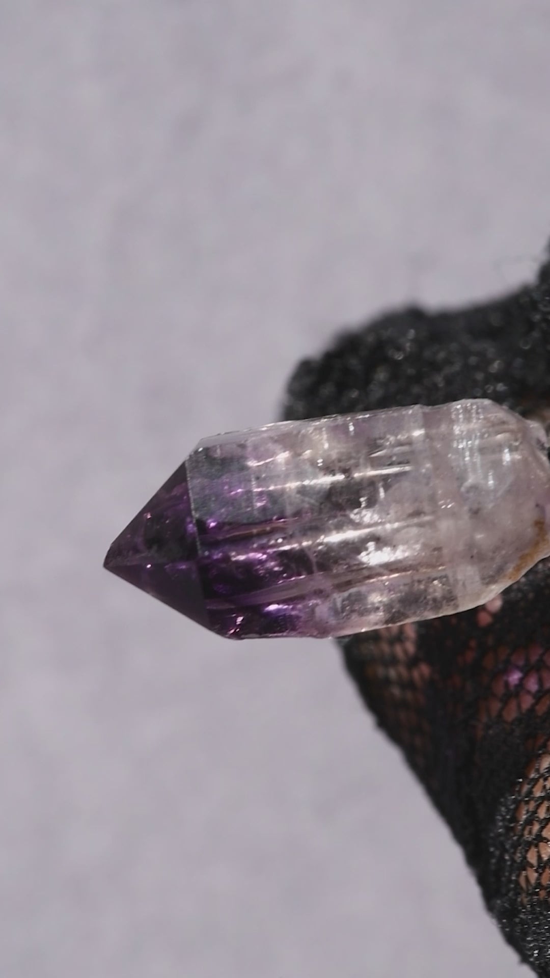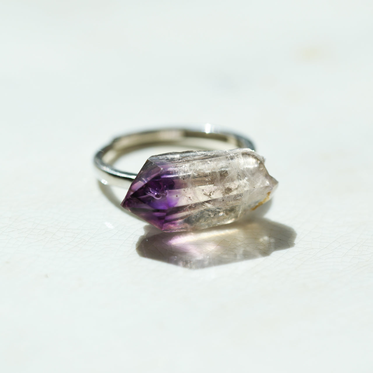 This free-size ring is made from raw amethyst and Silver 925 (rhodium plated). The tip is a deep purple, creating a beautiful purple gradient. Its elongated shape gives it a bar-like design. Two holes are drilled for inserting metal parts to securely set the stone.